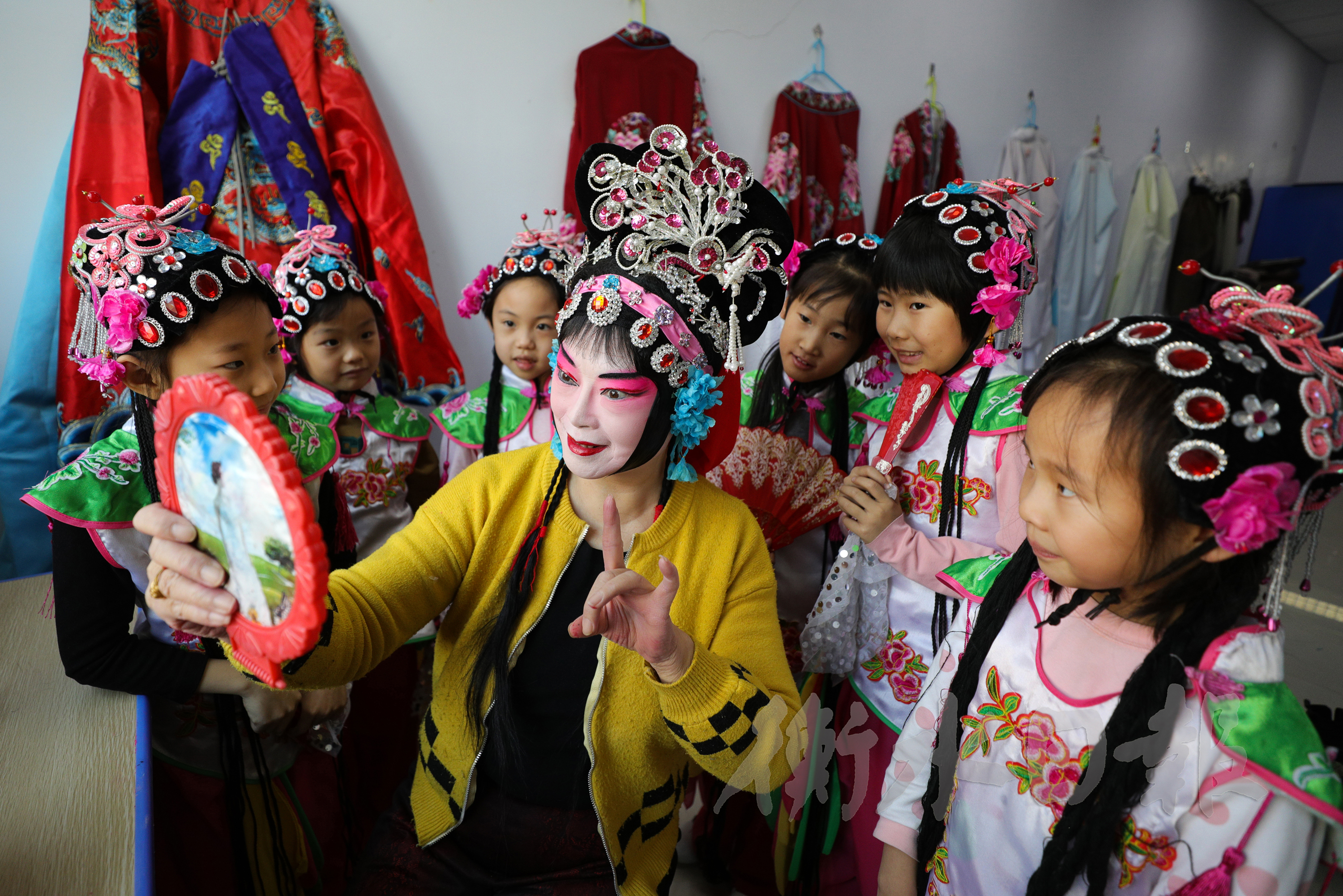 在勝利小學音樂舞蹈室,為了讓孩子們全面感受京劇氛圍,陳榮段打算來一次帶妝排練。給孩子們逐一穿上戲服后,應邀前來的朋友幫陳榮段一起畫妝。妝容初現,孩子們圍著她,有的露出笑容,有的目不轉睛……在另外一間教室,肖世明給學生們悉心指導著小生形體動作。