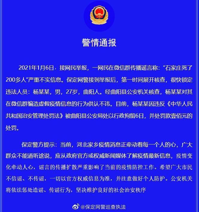1月7日,河北保定網警發布警情通報,2021年1月6日,接網民舉報,一網民在微信群傳播謠言稱:“石家莊死了200多人”嚴重不實信息。保定網警接到舉報后,第一時間展開核查,很快鎖定違法人員:楊某某,男,27歲,曲陽人。經曲陽縣公安機關核查,楊某某對其在微信群編造虛假疫情信息的行為供認不諱。目前,楊某某因違法《中華人民共和國治安管理處罰法》被曲陽縣公安局處以行政拘留6日,并處100元罰款。