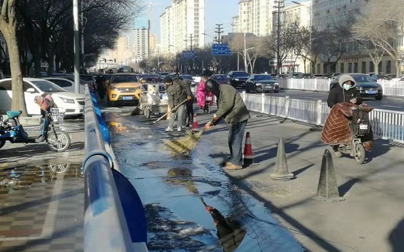 記者在現場看到,小區附近便道的一處路面,有水正汩汩流出,一直流到非機動車道上,由于天氣寒冷,路面已經結冰。維修人員在現場放置了交通錐,撒了融雪劑融化積冰,并清理積水。很快,衡水水務公司供水部門人員前往現場,組織搶修人員動用機械挖開路面進行維修。