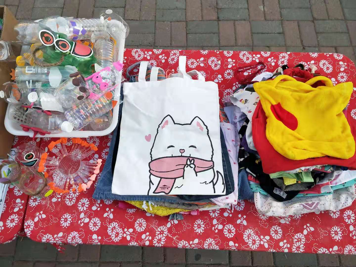 家長(zhǎng)和孩子利用廢舊物品做成的筆筒、環(huán)保袋。李莉 攝