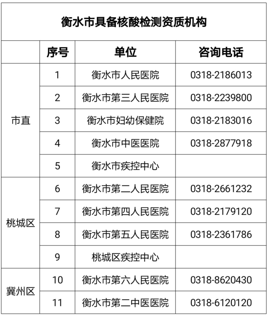 從衡水市衛生健康委獲悉,目前,全市具備核酸檢測資質的醫療衛生機構共有39家,涵蓋全市各縣市區。“愿檢盡檢”人群可就近到具備資質的核酸檢測醫療機構進行檢測。同時,其他暫不具備核酸檢測資質的醫療機構,可通過與有資質的機構簽訂協議為公眾提供核酸檢測服務。