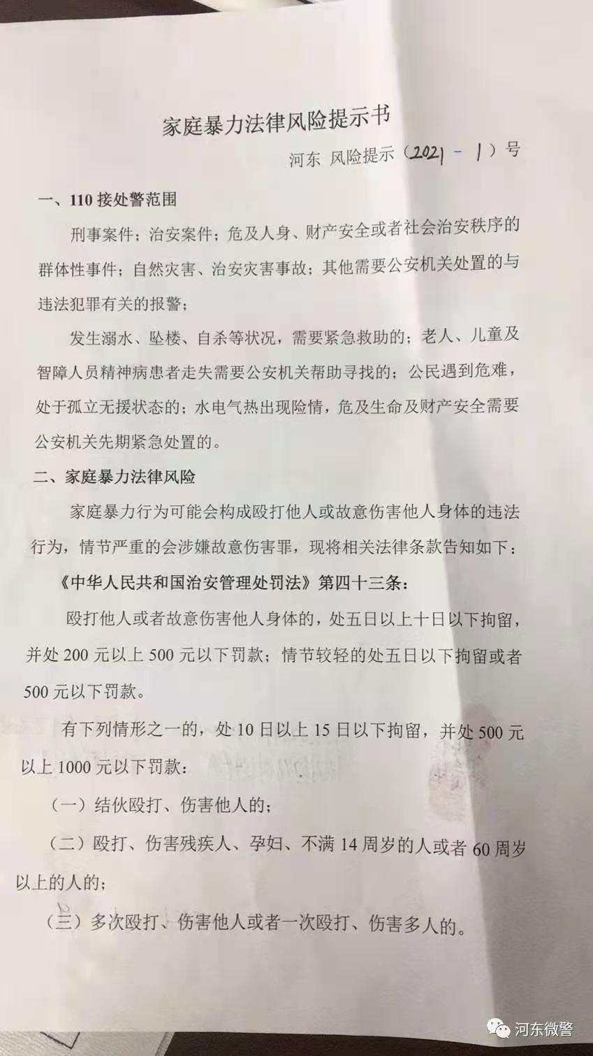 在了解案情后,河?xùn)|派出所民警對(duì)兩人進(jìn)行了勸阻。同時(shí),按照“誰執(zhí)法、誰普法”的原則,為提高群眾認(rèn)知能力,增強(qiáng)公眾的風(fēng)險(xiǎn)意識(shí)、辨別能力,河?xùn)|派出所開具了轄區(qū)第一份《家庭暴力法律風(fēng)險(xiǎn)提示書》,對(duì)夫妻倆特別是施暴人予以了批評(píng)教育,當(dāng)事人表示悔改。