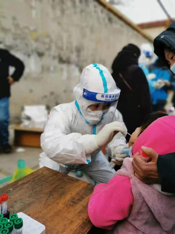 正值數(shù)九寒天、冷風(fēng)刺骨,當(dāng)?shù)刈畹蜌鉁氐椭亮阆?6℃。在露天采集點(diǎn),隊(duì)員們穿著全套防護(hù)裝備進(jìn)行核酸采樣,在凜冽的寒風(fēng)里站上幾分鐘整個(gè)人就被“凍透”,口中呼出的熱氣很快在面屏上結(jié)成了冰霧,連采集的咽拭子試管都結(jié)了冰霜。但面對(duì)等待采樣的村民,大家早已將嚴(yán)寒、疲憊拋之腦后,鉚足了勁兒堅(jiān)持著、奮戰(zhàn)著。從早晨8點(diǎn)一直忙到晚上八九點(diǎn),隊(duì)員們有時(shí)連續(xù)工作6小時(shí),中午連飯都顧不上吃,在替崗人員到來后才稍作停歇,匆匆吃口泡面……因怕上廁所穿脫防護(hù)服耽誤時(shí)間,每個(gè)隊(duì)員都不敢喝水。