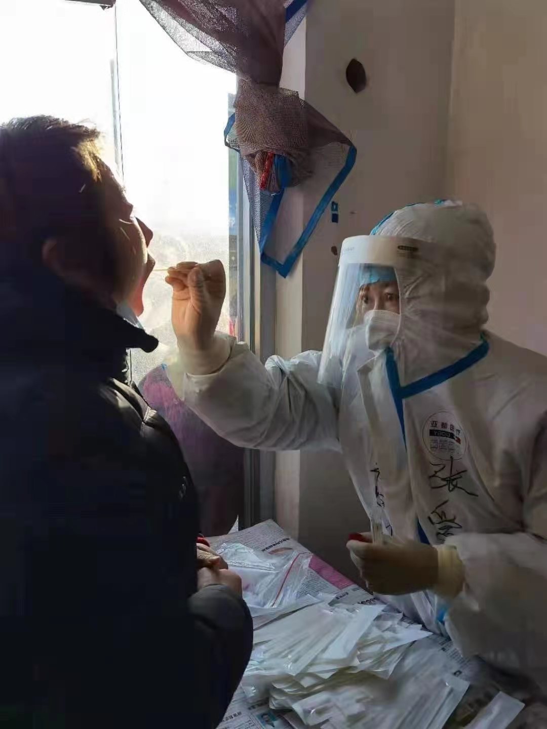 時間就是生命,只有全力以赴才能取得這場戰疫的勝利。到達藁城區后,她們立刻做防護,分任務,立要求,崔艷霞是帶隊隊長,也是五人里年齡最大的,戶外采集工作一站就是幾個小時,耳朵被凍,手指也因為太冷凍得僵硬伸不直。更加艱難的是,她們中有4人正在經期,身體要承受雙重考驗。院領導得知前線生活用品不充裕,想為她們送去補給,崔艷霞考慮到藁城是高風險地區,為了避免接觸感染的風險,堅持謝絕了院領導的心意。