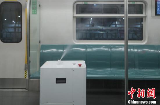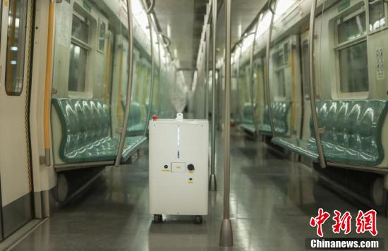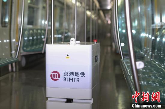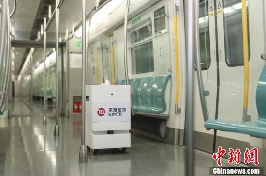 1月18日,北京,京港地鐵4號線馬家堡車輛段,消毒機器人在對列車車廂消毒。