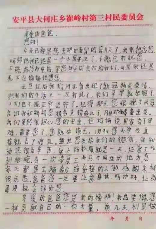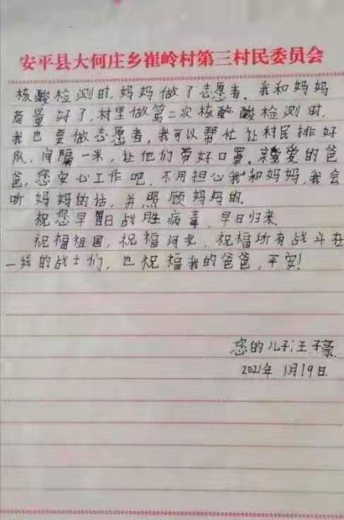 王子豪的媽媽李亞平,是安平縣大何莊鄉中心校崔嶺小學的一名老師,在前不久南崔嶺村進行核酸檢測時,李亞平做了志愿者。王子豪告訴記者:“由于爸爸在一線抗疫,隨時都有任務,媽媽怕打擾到他,一直沒有跟爸爸視頻過,所以我已經好些天沒有見到他了,非常想念爸爸。在媽媽的鼓勵下,我給爸爸寫了一封信,用微信發給了他。我要告訴爸爸,他是我的榜樣,我為他自豪。”