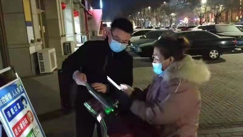 值班黨員對小區居民進行掃碼檢查。李影 攝