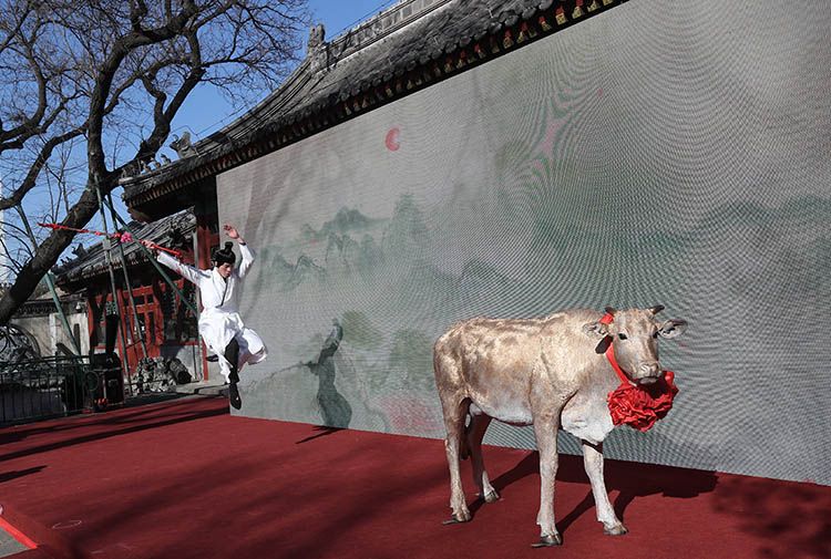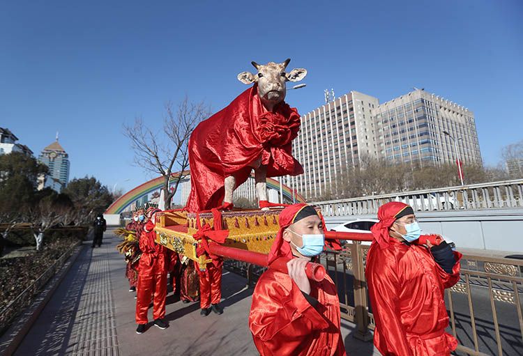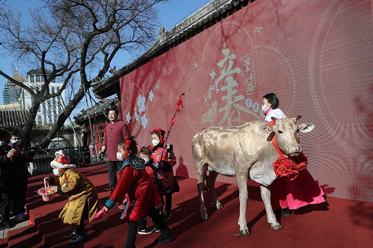 2月2日,東城區(qū)建國(guó)門(mén)街道在古觀象臺(tái)舉行鞭打“春牛”儀式迎立春,祈福五谷豐登。“東風(fēng)解凍,蟄蟲(chóng)始振,魚(yú)陟負(fù)冰,2月3日22點(diǎn)58分39秒,立春”,北京天文臺(tái)副臺(tái)長(zhǎng)、北京古觀象臺(tái)臺(tái)長(zhǎng)齊銳在觀象臺(tái)門(mén)下宣布立春時(shí)間。立春作為二十四節(jié)氣之首,反映著一年四季的更替,意味著新的一個(gè)輪回已開(kāi)啟,新年之始。圖為:演員表演《鞭打春牛》。