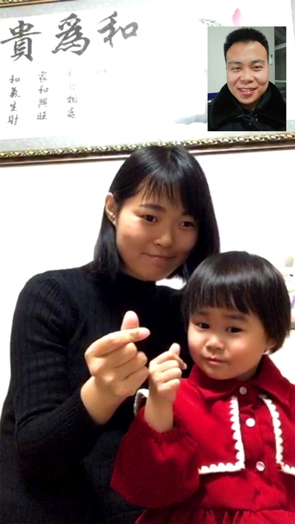 陳旭光與妻子、女兒視頻連線,妻女對(duì)他比心示愛(ài)。