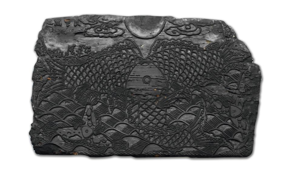 武強年畫《三魚爭月》墨線版,長 45 厘米、寬 30 厘米,杜梨木質地,形式為四裁,畫版左上端(印出畫面為右)有四字,即畫名,曰:三魚爭月。畫面中,三條肥碩的大鯉魚共用著一個魚頭,它們使足了力氣擺尾翻身,爭相躍出水面,去爭奪天上的一輪明月。平靜的水面被它們掀起了萬頃波濤,頗具氣勢。對比三魚之巨,左右兩邊還各安排了一組可愛的小魚作為陪襯,也同樣在競相“爭月”。