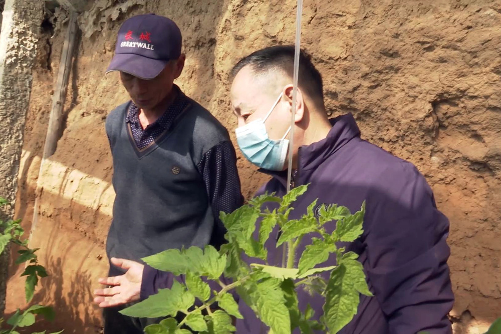 農(nóng)藝師趙建仁(右)在蔬菜大棚內(nèi)查看土質(zhì)。袁林 攝