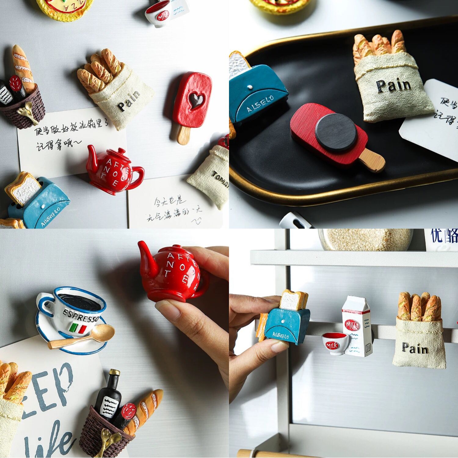縮小版的仿真食物貼在冰箱表面呈現一個亮麗的畫板,仿佛是一桌豐盛的晚宴。據了解,該系列的仿真食物冰箱貼款式多樣,有紅色茶壺、紅色牛奶盒、麻布袋面包、蘑菇披薩等,似乎打開冰箱就能找到你愛的美味,同時,也給廚房空間增添了不少色彩。