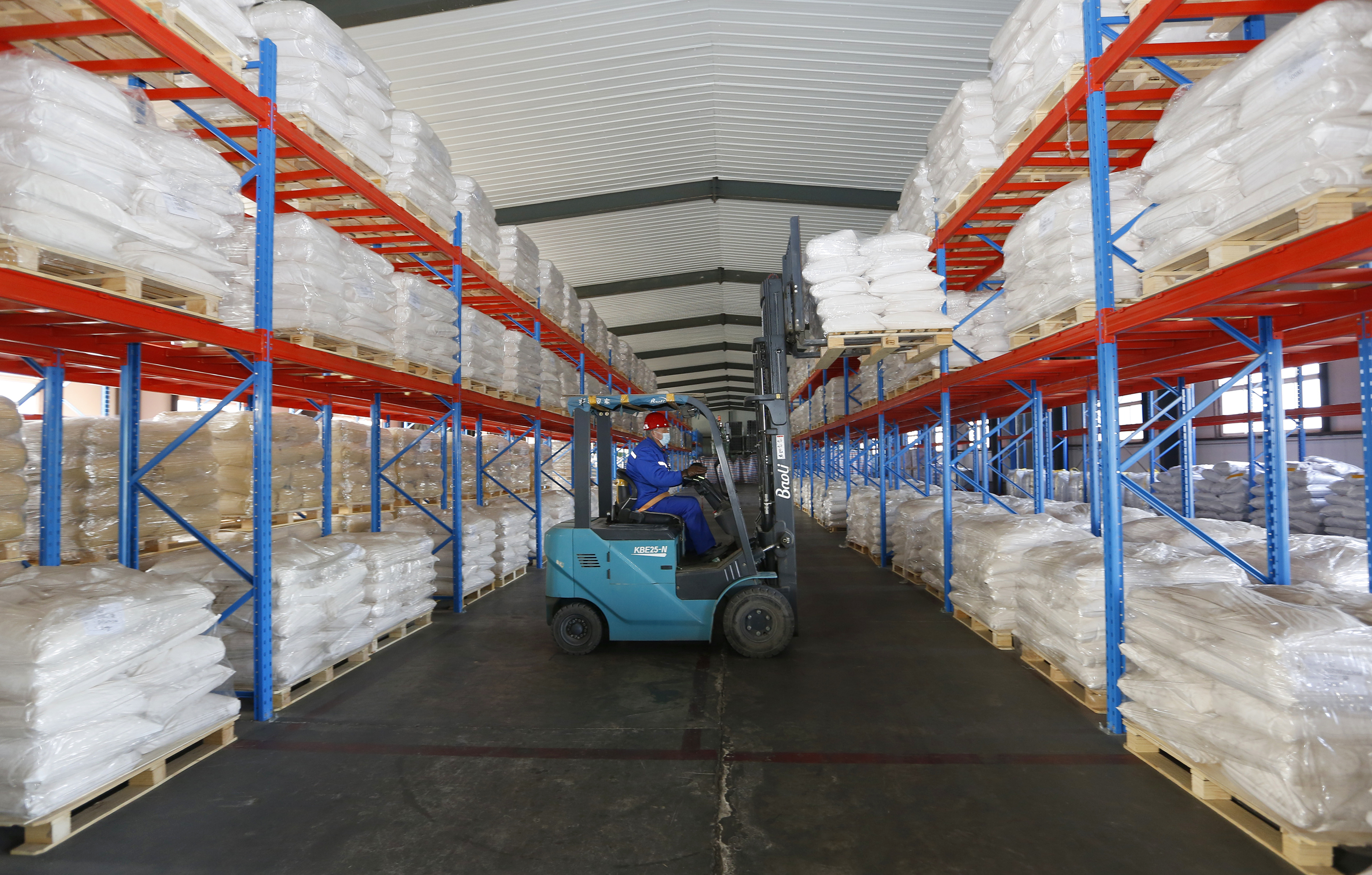 利安隆凱亞(河北)新材料有限公司一號成品庫工作人員將質檢合格的產品碼放整齊。