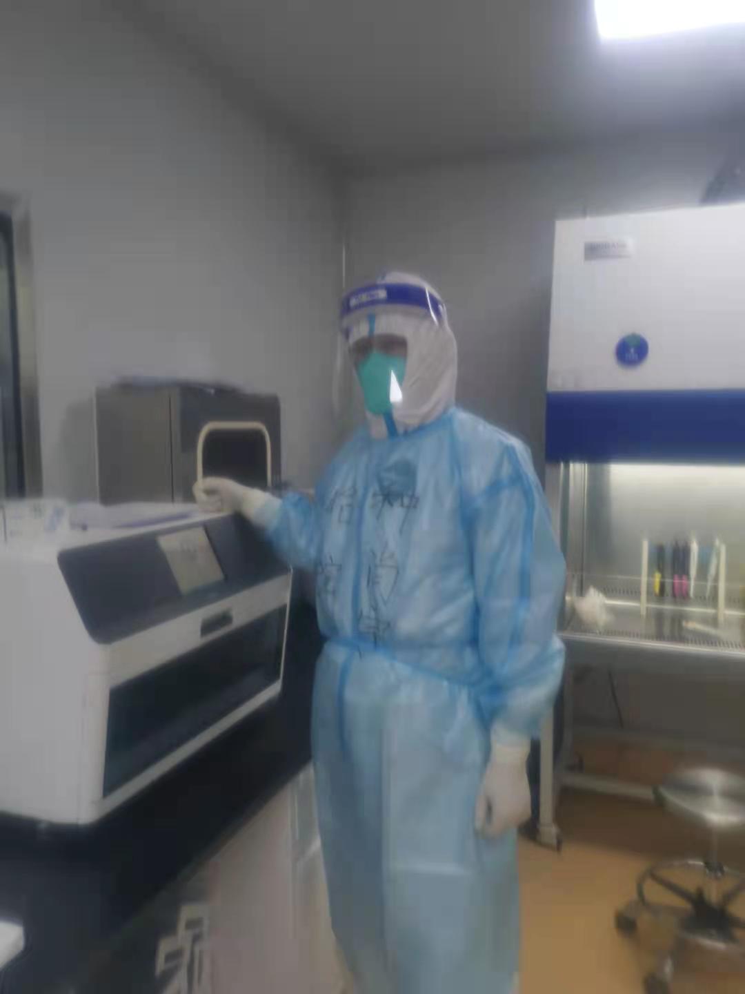 對張長庚主任的這番見解,種肖宇是心悅誠服的。他說,“我是黨員我先上,這是戰(zhàn)‘疫’的時代最強音。置身在哈院這樣具有光榮革命傳統(tǒng)的先進集體,有科室團隊的良好熏染,我必定盡自己所能,讓防控疫情斗爭一線揚起哈院的青春旗幟!”1月26日上午,作為衡水緊急支援石家莊核酸檢測任務(wù)的一員,種肖宇奔赴河北醫(yī)科大學(xué)第一醫(yī)院支援當(dāng)?shù)厝珕T核酸檢測工作。“河北醫(yī)科大學(xué)第一醫(yī)院檢驗中心,系國家公共檢測實驗室,肩負著藁城區(qū)、裕華區(qū)、新樂市、平山縣等地的樣本檢測,24小時連軸運轉(zhuǎn)。白天采集的咽拭子送到時,差不多是晚上了。因為任務(wù)緊急,必要時不得不通宵工作。只要在崗,我們每個人必定是汗流浹背。但大家都鼓足了干勁,盼著早點兒戰(zhàn)勝疫情!”種肖宇胸有成竹地說,提取、加樣、PCR擴增、結(jié)果分析,每一個工作步驟都關(guān)系到核酸檢測的質(zhì)量和安全性,每一次與樣本的接觸都面臨著被感染的高風(fēng)險。穿著三層防護服、戴著護目鏡、手套、靴套,每一分、每一秒都是對體力和耐力的巨大消耗,很快就會感到缺氧憋悶,這難免造成情緒上的波動。對此,種肖宇非常淡定地說,“這就要葆有心態(tài)上的積極樂觀。因平日訓(xùn)練有素,一進入崗位便忘我地投入進來,很快就適應(yīng)了工作節(jié)奏。”因為每次實驗需要3到4人的密切配合才能完成,試驗前后要對環(huán)境進行清潔和全方位消毒,部分實驗用品和醫(yī)療垃圾進行分批次消毒滅菌。種肖宇時刻沖在前、干在前,專撿著累活干,他用主動擔(dān)當(dāng),為這個來自各地的團隊帶來著和諧和高效。