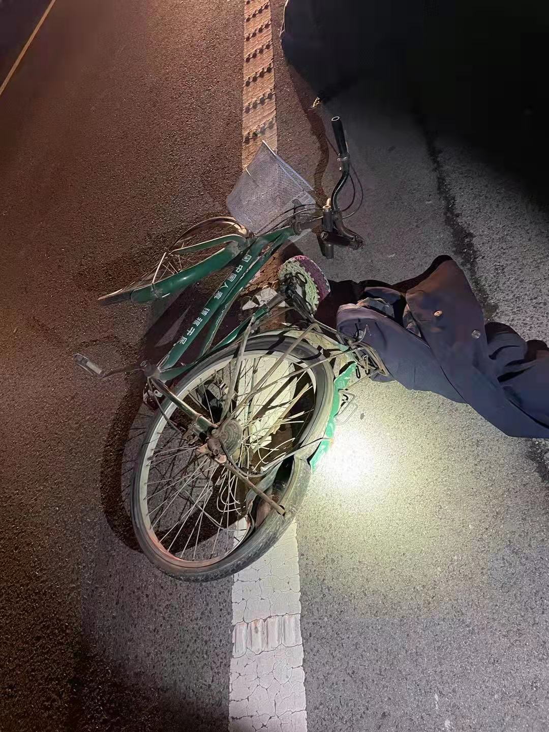 21時10分許,事故民警到達現場,發現一名老人躺在中央護欄處,身旁另有一輛被撞擊變形的自行車。民警在對事故現場拍照取證后,對造成該事故的車輛駕駛人進行了詢問。