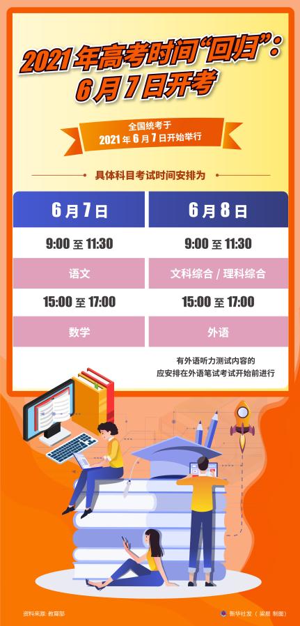 2021年高考全國統考時間“回歸”,確定為6月7日、8日。受新冠肺炎疫情影響,2020年高考曾延期至7月舉行。