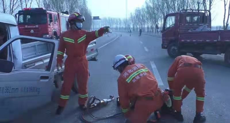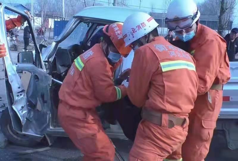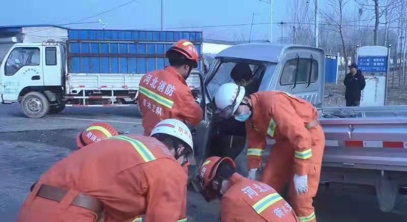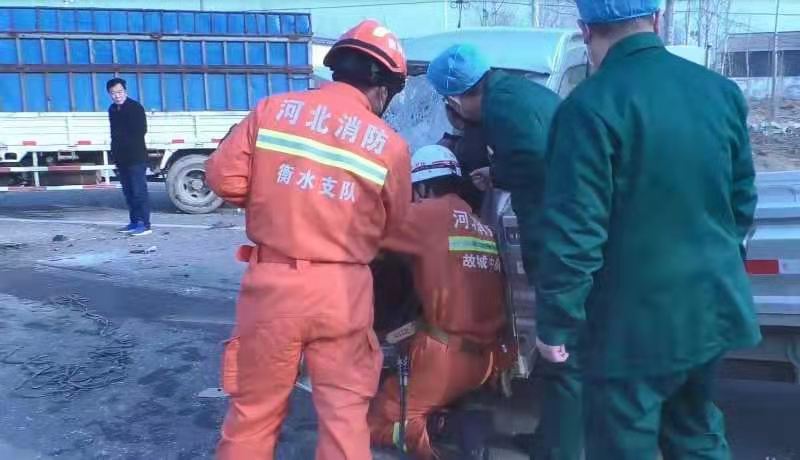 3月10日,衡水市消防救援支隊故城大隊接到報警稱,故城縣裘都大道三朗鎮段發生車禍,兩輛貨車相撞,一人被困。故城江源大街消防站立即調派1輛搶險救援車、1輛城市主戰消防車和12名指戰員趕赴事故現場。