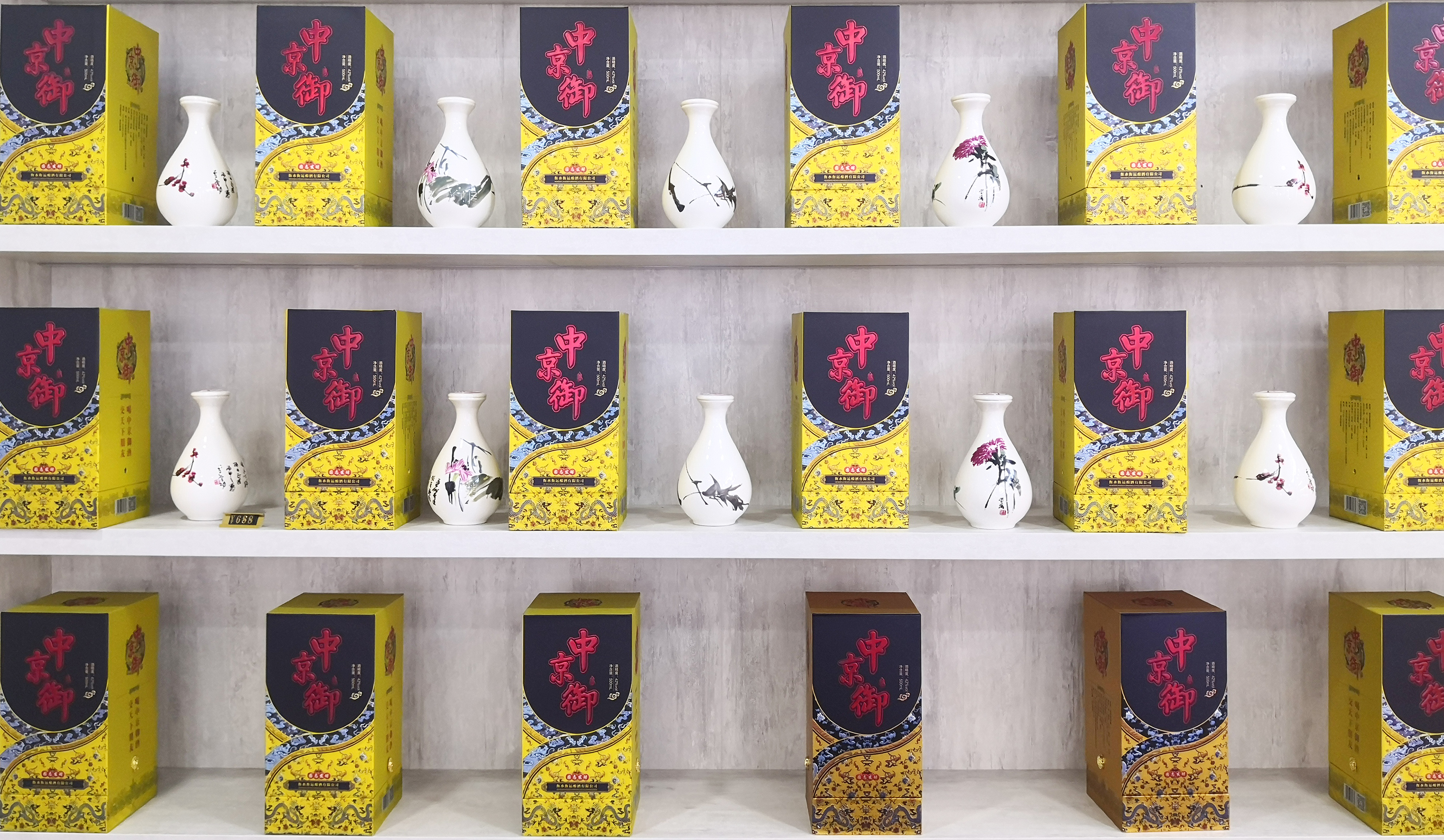 中京御酒以高粱,小麥,大米,玉米,糯米五糧為生產原料,新鮮稻殼為輔料,踩制中高溫大曲為糖化發酵劑,混蒸混燒,精心釀造而成。該酒采用傳統老五甑續渣低溫發酵,發酵周期由原來每周期60天延長至120天(一般大曲酒發酵周期45一60天)。該酒品充分利用中高溫大曲發酵機理,分層入池踩窖,采用高厚封頭窖泥,密封嚴密。中京御酒瓶體使用國內最優質的骨質瓷,瓶體有國內知名作家、畫家李學功老師字畫,具有極高的收藏價值。