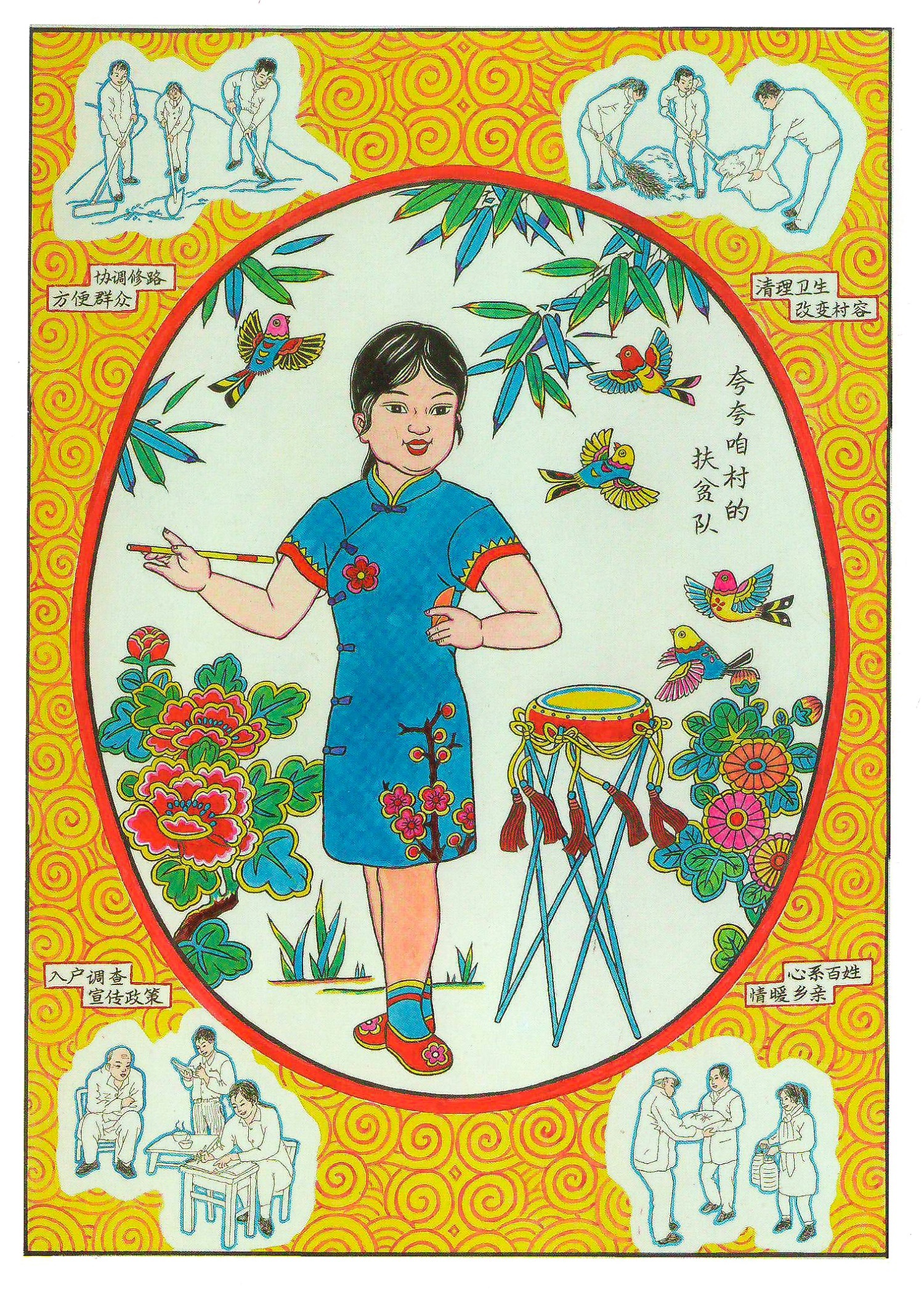 這幅作品描繪了一位藝人正在表演西河大鼓,用這種深受群眾喜愛的曲藝形式贊揚了駐村工作隊,四角則以速寫的形式展現了隊員們在脫貧攻堅戰中努力工作的身影,表現了廣大扶貧工作者不辭辛勞、克服困難、盡職盡責,堅決打贏脫貧攻堅戰的奮斗精神。