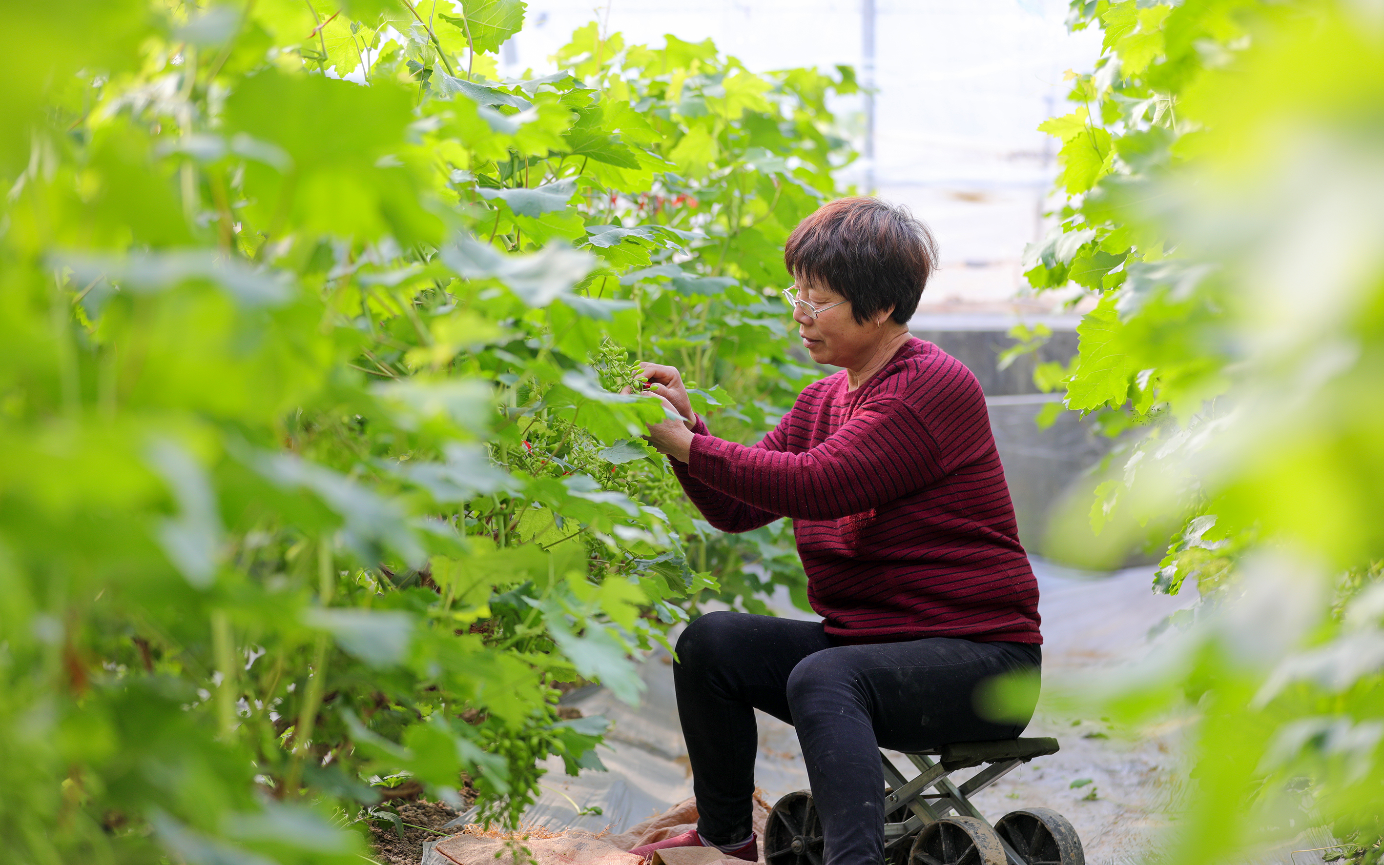 2021年3月24日,衡水市桃城區趙圈鎮胡家堂村村民在大棚內為葡萄疏果。