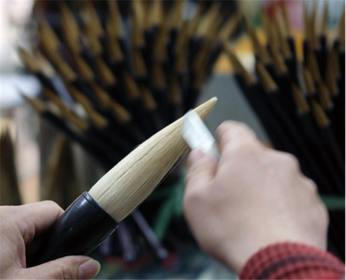 刷筆是把毛筆筆頭放在水中用刷子反復刷洗,去除筆頭中的雜質。用刷子將筆頭刷平整,然后再擇筆尖。這又被稱為修筆尖。擇筆尖是十分精細的過程,要將筆尖處沒有毛峰的雜毛去掉。這個過程對毛筆質量的好壞影響極大。操作時必須凝神、平氣、心靜才能擇好。擇完尖后,進行修齊環節,即摘除筆尖中過長的毫毛。修齊的標準是將筆頭前鋒壓平,筆尖處的毛豪長短一致,沒有參差,當筆頭合并時要緊如一點。修齊后要做“清脖”工作,毛筆頭的蓋毛中也含有雜毛,必須將其清除。一只合格的毛筆,它的著力點要均勻,能運筆自如,揮灑暢順。因此,“清脖”完成之后,要檢驗毛筆頭的另一個特性:健。將筆頭在手上反復刷寫,來感受毛筆的柔韌度,看剛柔是否適度。這個動作看似簡單,但需要有幾十年制筆經驗的人才能準確地掌握。