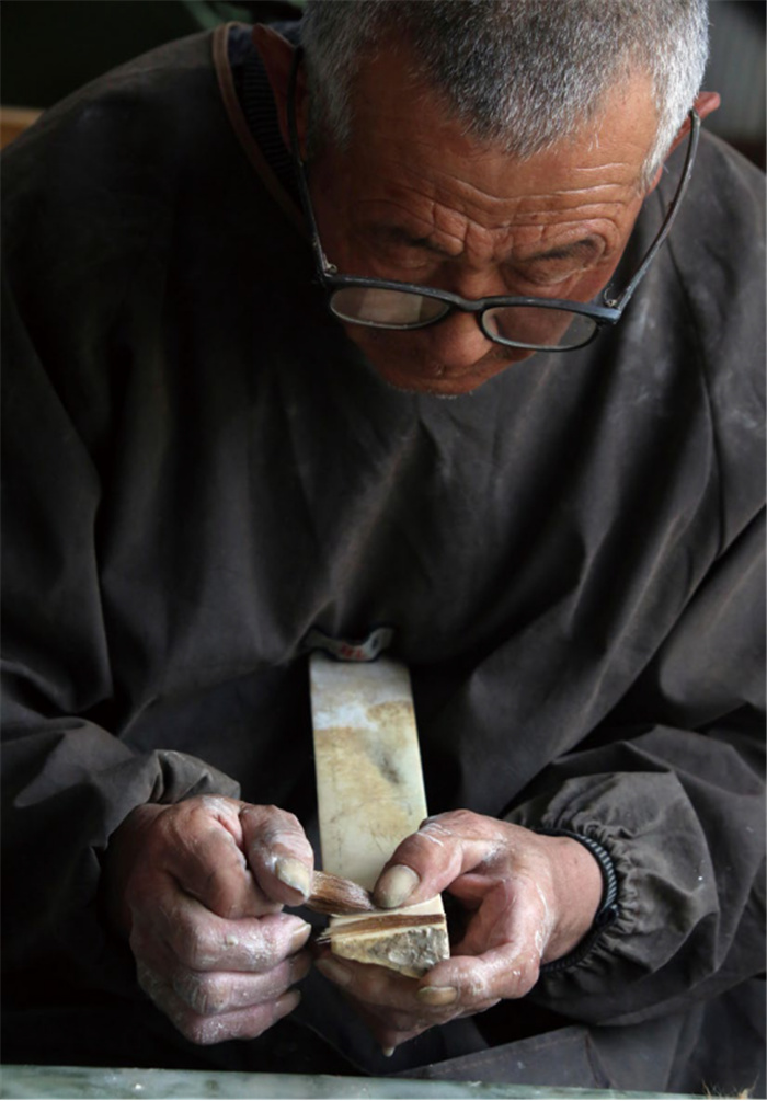 首先是選料,制作筆頭的原料要選取東北大小興安嶺質量上乘的黃鼠狼尾。將狼毫從黃鼠狼尾巴上拔下來,搓成尖錐狀,放在水盆中完全浸濕,再將狼毫的根部在板臺上墩實。用牛骨梳子將狼毫由毛尖兒向毛根方向慢慢梳理,這個工序叫挑羽子。梳子將狼毫中短小無韌性的絨毛和雜毛挑到一側并去除。挑完羽子之后,將毛尖部分,再次放進水盆中浸濕。