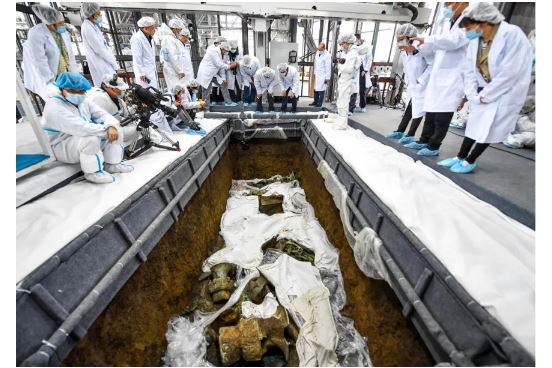 三星堆考古現場三號坑中頭戴青銅罍的青銅人,這件文物仍在發掘當中。截圖出自央視新聞頻道三星堆考古現場實時直播畫面。