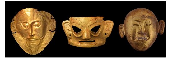 左圖:“阿伽門農的金面具”,出自希臘國家考古博物館;中圖:金沙遺址出土的商周金面具,出自金沙遺址博物館;右圖:遼代陳國公主金面具,出自金沙遺址博物館“金色記憶”特展。