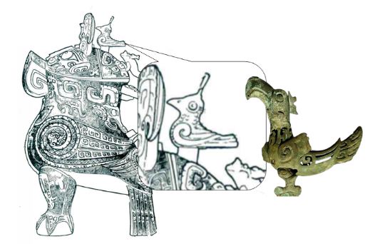 左圖:商代婦好墓出土的鸮尊線描圖,現藏河南博物院;右圖:三星堆遺址出土的青銅神樹上的立鳥,出自四川廣漢三星堆博物館官方微博,請注意兩者在紋飾上的相似之處。