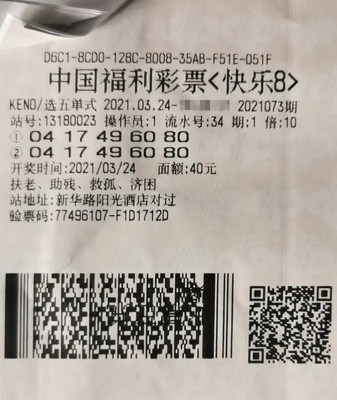 3月24日,快樂8第2021073期,衡水市桃城區新華路陽光酒店對過13180023站一位彩民10倍投注2注完全相同的“選五”單式號碼,獲得獎金2萬元。