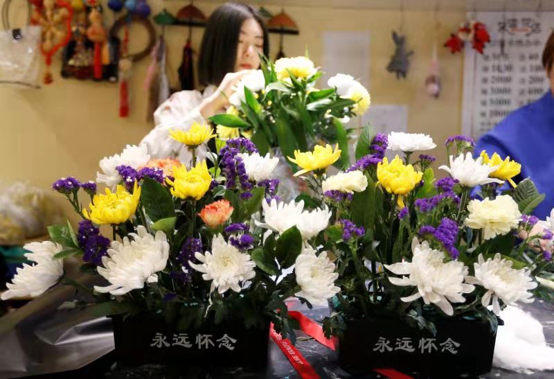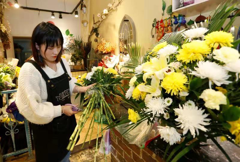 4月1日,報(bào)社街花語(yǔ)花店工作人員正在打理顧客預(yù)訂花束。