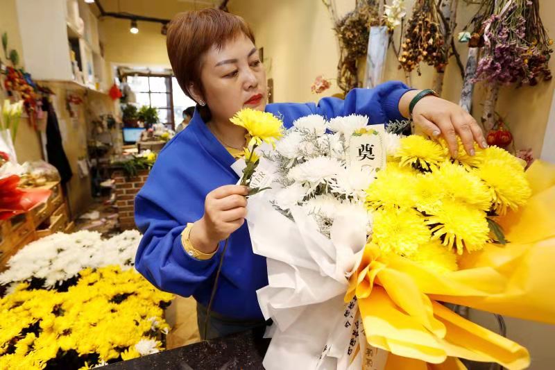 報(bào)社街花語(yǔ)花店工作人員正在整理菊花。