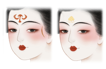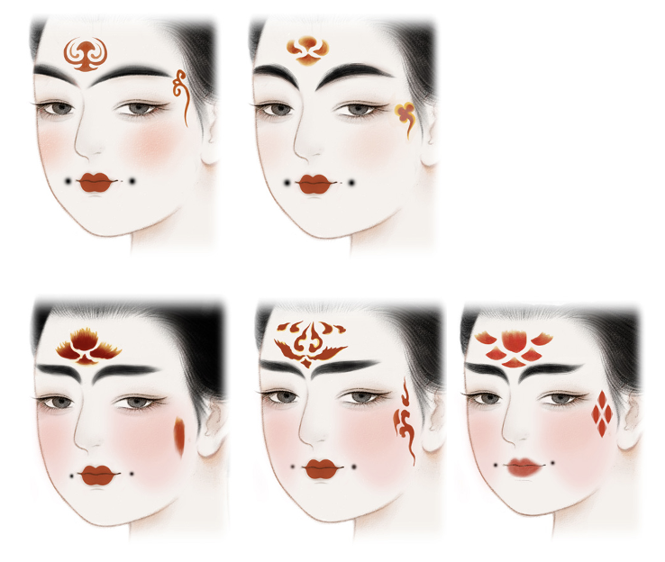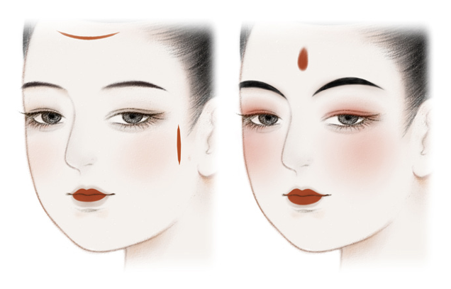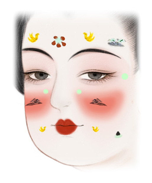 花鈿式樣更為豐富,有些甚至用華麗的金銀珠玉制作;面靨可貼在嘴角及眼下承淚等處;斜紅除常規形態外更有作五色飛鳥狀的。