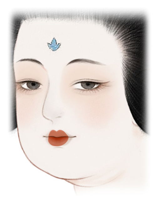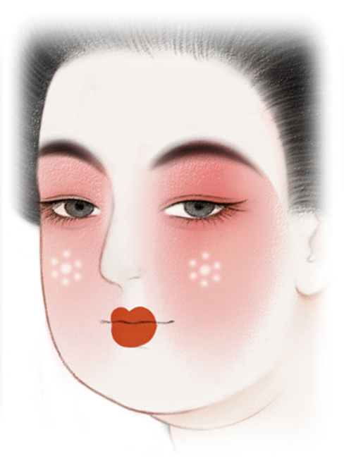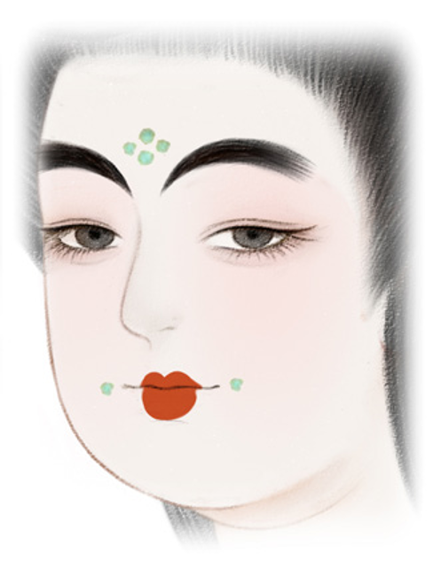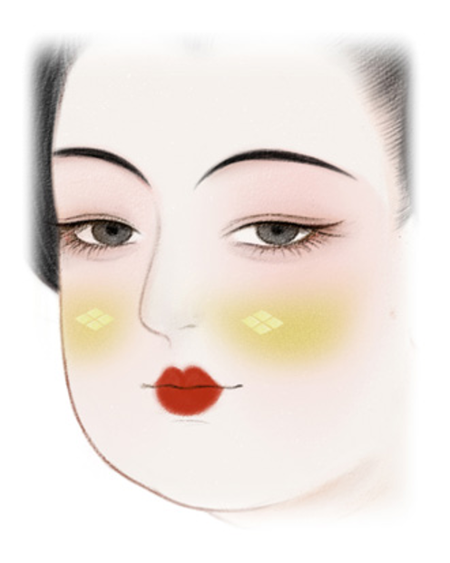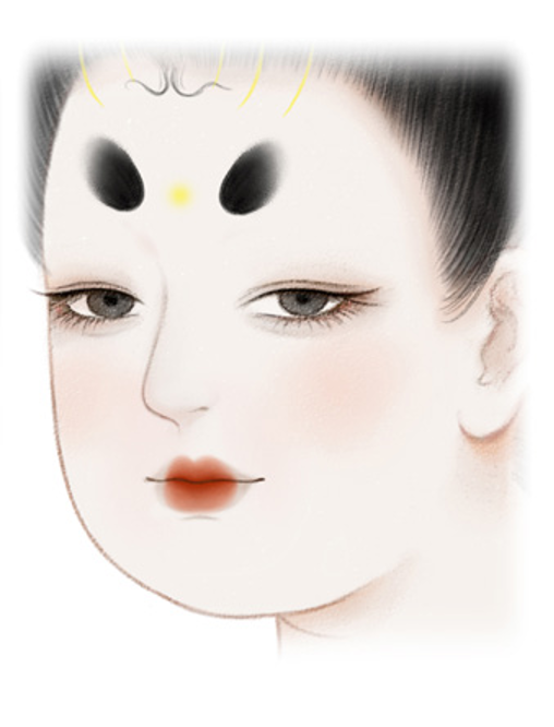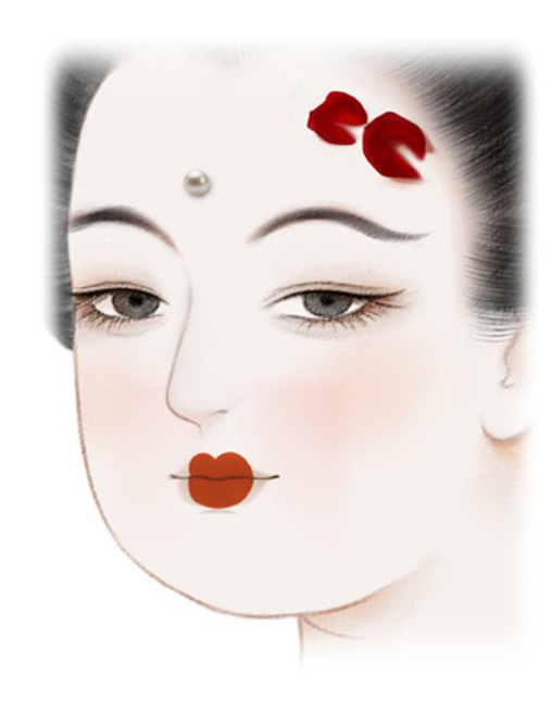 傳說中天寶年間后宮嬪妃喜愛的妝容,在臉頰以素粉點上花樣。