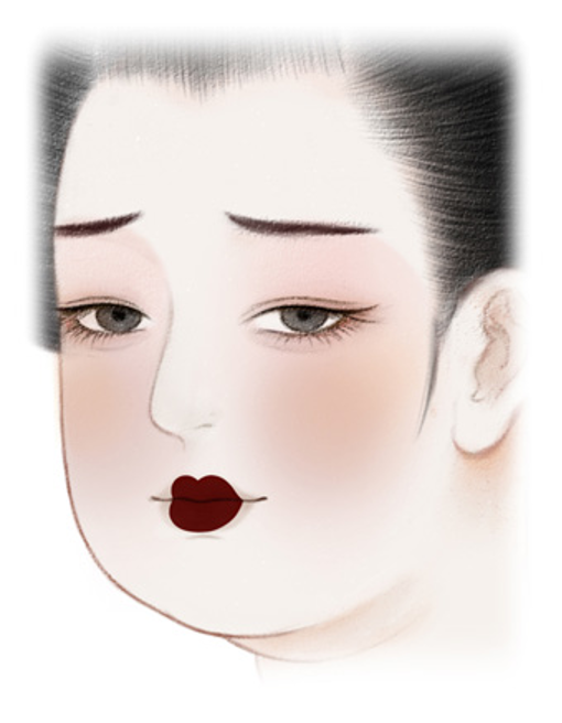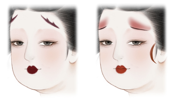 雙眉畫作悲愁似啼的八字狀;斜紅與面妝融合,只表現為臉畔紅粉的淺淺邊際線,如被眼淚染出痕跡一般。