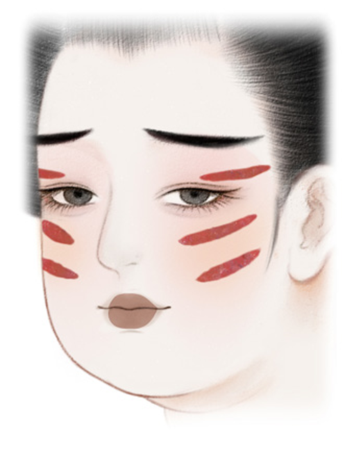 在貞元式妝容的基礎上進一步夸張化,不用胭脂粉妝而是仿效游牧民族的“赭面”習俗,再畫出八字愁眉與烏色嘴唇。