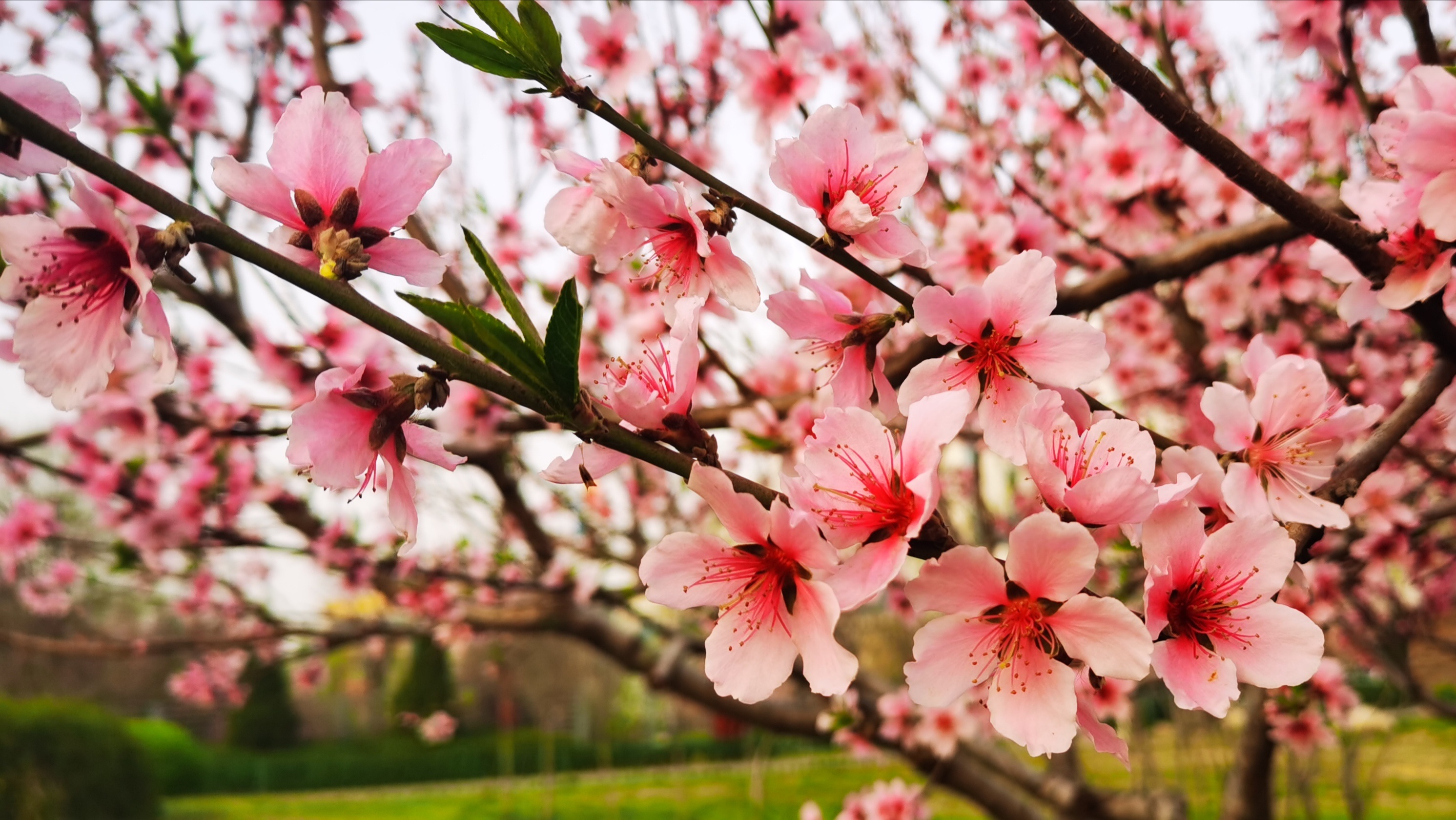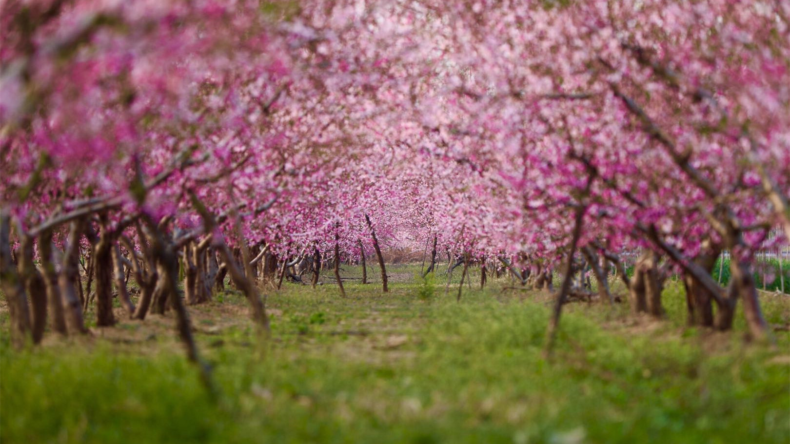 城邊村莊的那一片桃林,樹枝擺著各式的造型,手觸摸著枝干,一種滄桑的感覺在手指間流動。滿眼的粉紅,朵朵桃花爭先恐后地競相怒放。