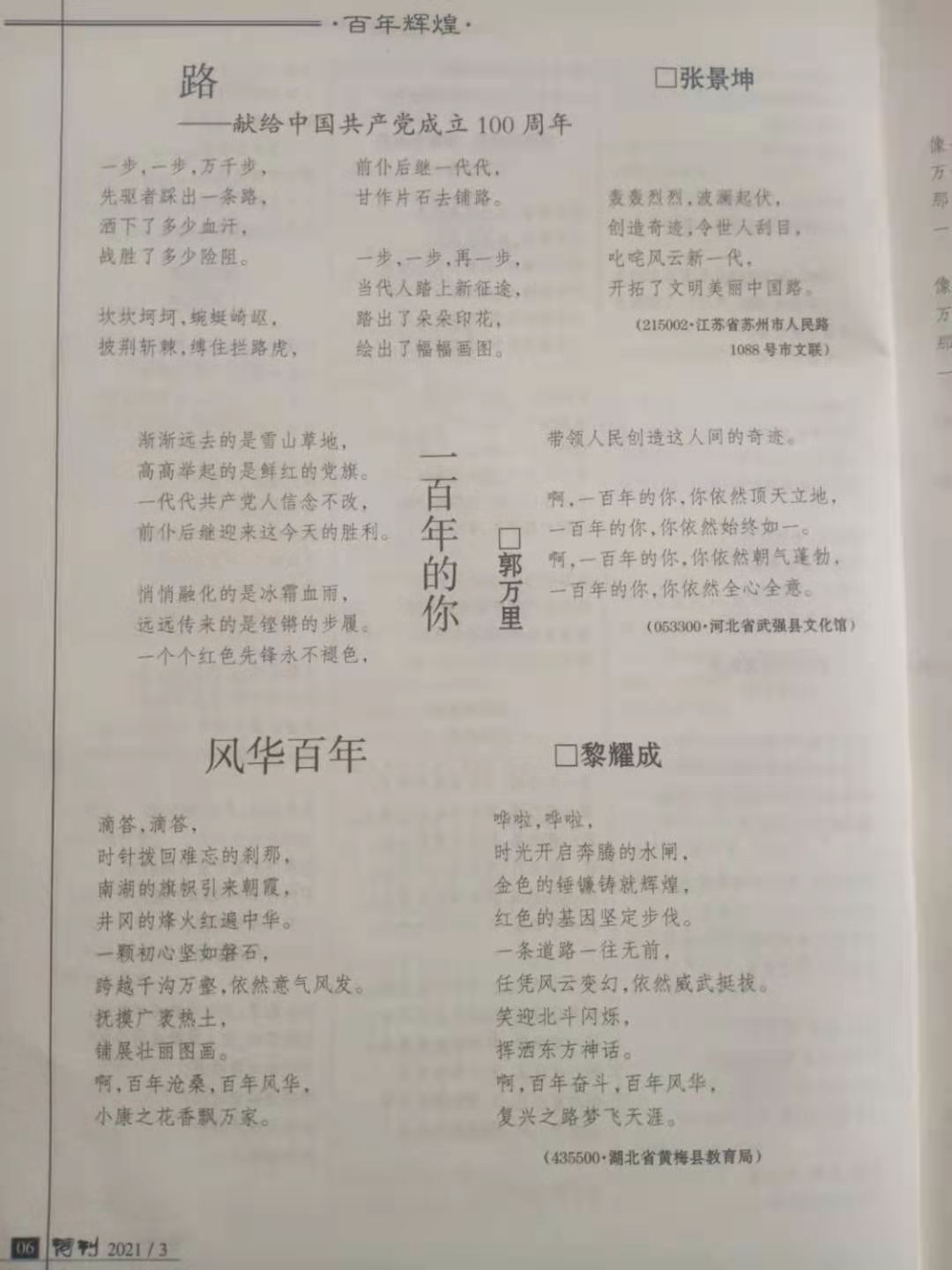 “黨史不僅能夠記載在文獻里,也應該穿插進歌詞中,讓更多的人傳唱,從而擴大紅色文化的影響力和傳播力。”今年56歲的郭萬里是一名老黨員,還是一名優秀的詞作者,曾創作了不少優秀作品。他說,今年是中國共產黨百年華誕,作為一名詞作者,他心情澎湃,想創作百首紅歌寄托對黨的深摯祝福,也希望能夠通過原創歌曲生動再現黨的光輝歷程,傳承紅色精神。今年春節過后,他便開始準備創作素材,不僅翻閱了大量歷史資料,還觀看了不少戰爭片,同時通過參觀紀念館、紀念碑等方式來探尋精神、尋找靈感……自今年3月1日起,平時就愛好積累的他,滿懷激情、飽含深情開始創作,一發不可收,“下筆如有神”。為讓詞句更加生動、準確及精煉,每創作完一首歌詞,他都不厭其煩推敲斟酌,修改潤色,做到了精益求精。