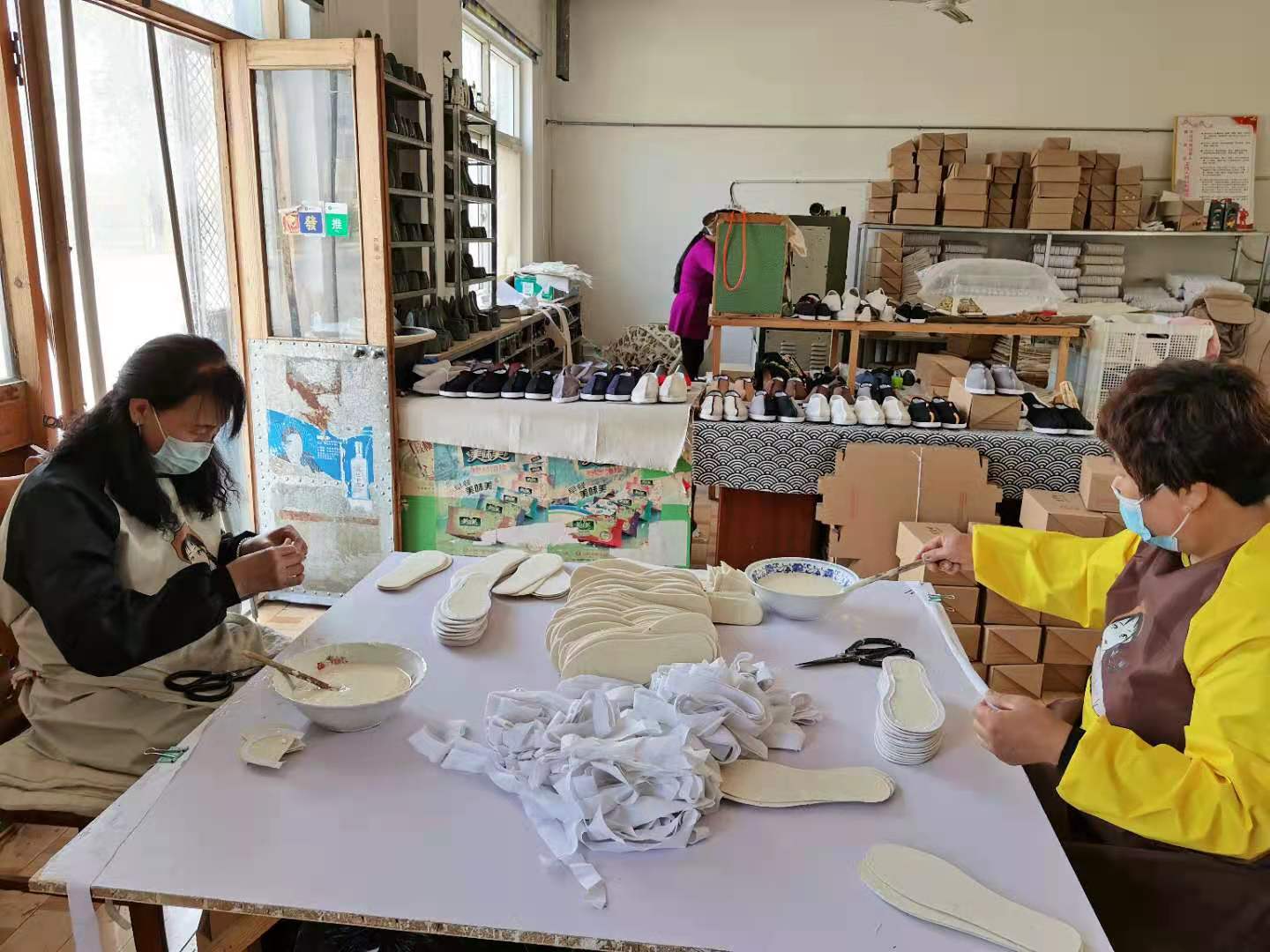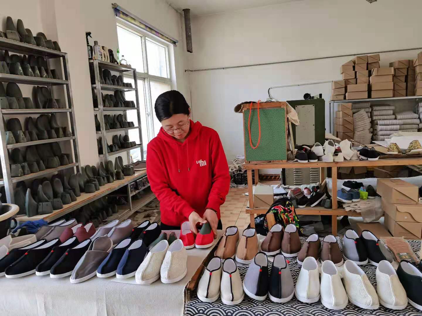 說干就干!夫妻倆在淘寶網開設了網店,又精挑細選出供貨商,進行“千層底”布鞋代賣?!澳懿荒茉谛嫔霞狱c裝飾?”“能幫我搭配漢服做雙鞋嗎?”顧客逐漸增多,大家的需求呈現出多樣和個性化的特點,代賣鞋品漸漸不能滿足顧客要求。溫繼偉和丈夫思來想去,決定創辦自己的鞋廠——2017年初,他們在大白鄉政府的積極幫助下,獲得了阜城縣團委的創業政策扶持,又自己出資10萬元,創建了阜城縣禪澤工藝布鞋廠,并購置來縫紉機、裁斷機等設備,滿懷期待開始了創業。