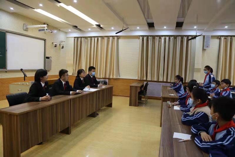 “現(xiàn)在開庭!”當(dāng)日上午,隨著五年級(jí)4班的“小法官”有模有樣地落下法槌,庭審正式開始。同學(xué)們迅速進(jìn)入角色,“審判員”“書記員”“公訴人”等各司其職,嚴(yán)格按照真實(shí)庭審流程進(jìn)行,整個(gè)過程中,大家都沉著冷靜,表述清楚,將庭審演繹得有模有樣,在角色扮演中切身體會(huì)到了遵法、學(xué)法、守法的重要性。模擬庭審結(jié)束后,市中級(jí)人民法院的法官們還結(jié)合案件中所運(yùn)用到的法律法規(guī)進(jìn)行了細(xì)致講解,并針對(duì)同學(xué)們提出的關(guān)于“未成年犯罪”“正當(dāng)防衛(wèi)”等熱點(diǎn)法律問題做出解答。隨后,他們還向?qū)W生們發(fā)放普法宣傳冊(cè)。