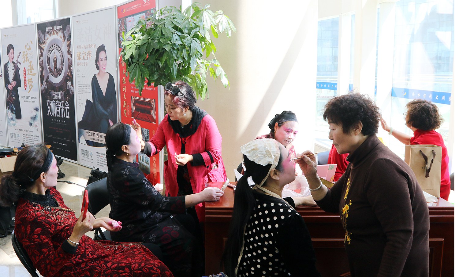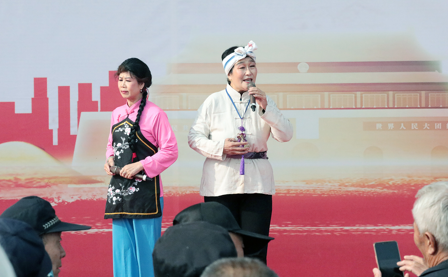 濱湖新區春之聲藝術團正表演評劇選段《小女婿·定情》。