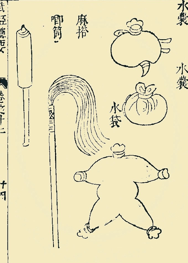 此外,宋朝的城市消防還使用到一些在當時很先進的器材,包括——水袋:“以馬牛雜畜皮渾脫為袋,貯水三四石。以大竹一丈,去節,縛于袋口。若火焚樓棚,則以壯士三五人持袋口向火蹙水注之”;水囊:“以豬牛胞盛水”,撲火時,“以囊擲火中”,是一種可投擲的滅火器;唧筒:“用長竹,下開竅,以絮裹水桿,自竅唧水”,大概是最早的消防泵;云梯:“以大木為床,下施大輪,上立二梯,各長二丈余,中施轉軸”,可用于高層建筑的救火。