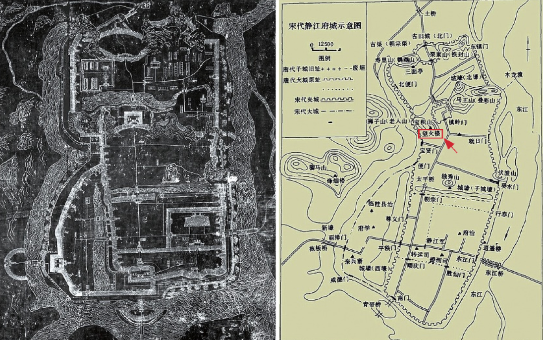 左圖為南宋《靜江府城池圖》石刻,上面繪有靜江府城的一座望火樓。右圖是根據石刻圖繪制的宋代靜江府城示意圖,選自蘇洪濟、何英德《〈靜江府城圖〉與宋代桂林城》。