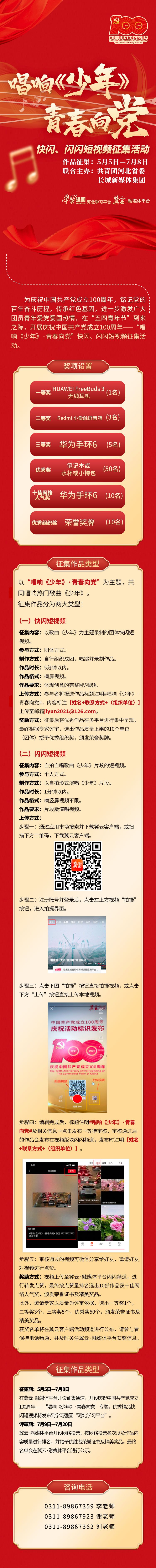 為慶祝中國共產黨成立100周年,進一步激發廣大團員青年愛黨愛國熱情,5月4日起,共青團河北省委與長城新媒體集團聯合啟動“唱響《少年》·青春向黨”快閃、閃閃短視頻征集活動,用歌聲浸潤新時代青年的心靈,展示中國當代青年的蓬勃朝氣和青春風采,引導他們勇做走在時代前列的奮進者、開拓者、奉獻者,為充滿希望的明天積蓄力量!