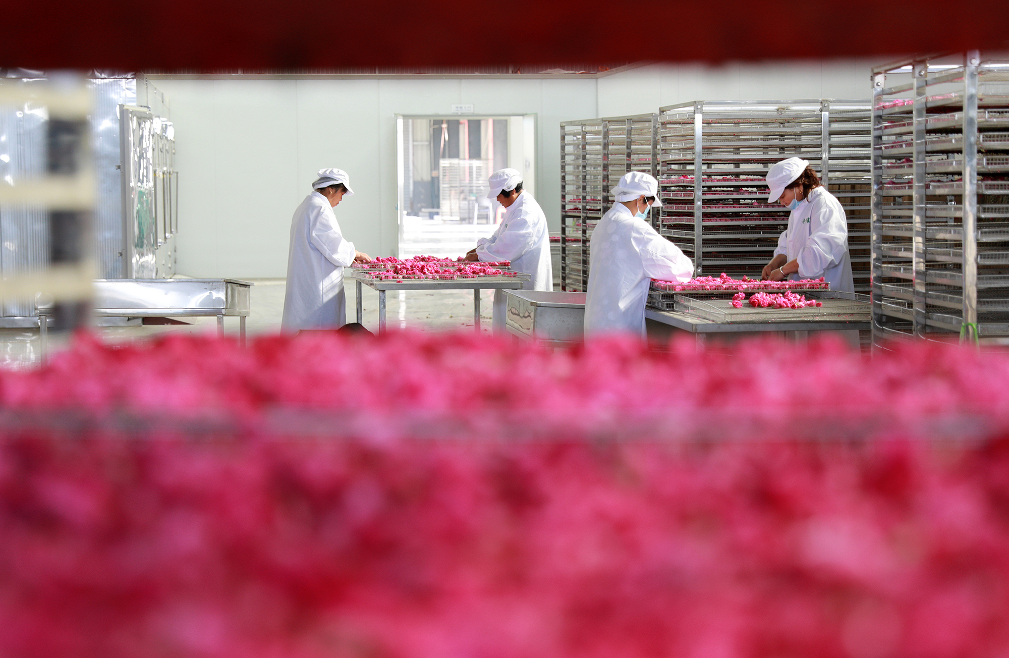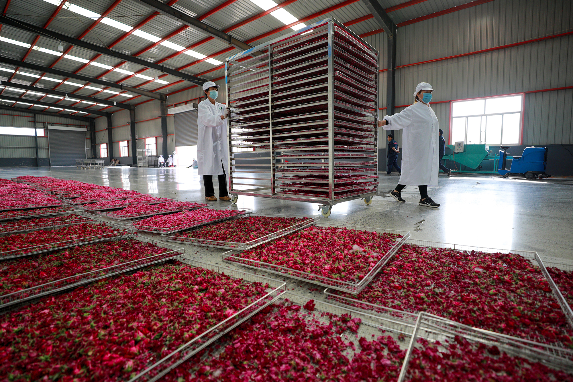 在阜城縣阜云農農業發展股份有限公司生產車間,工人正在為制作玫瑰精油做準備。