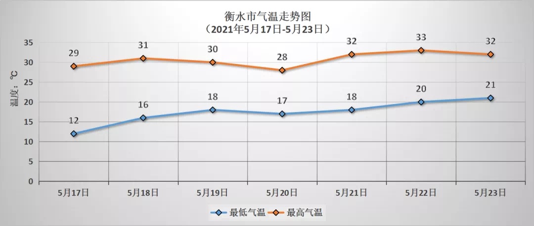 具體天氣預報為:5月16日夜間,多云,西南風2~3級,最低氣溫11℃到12℃;5月17日,晴間多云,29℃到12℃;5月18日,晴間多云,31℃到16℃;5月19日,多云間晴,30℃到18℃;5月20日,多云間晴,28℃到17℃;5月21日,晴間多云,32℃到18℃;5月22日,多云,33℃到20℃;5月23日,晴間多云,32℃到21℃。