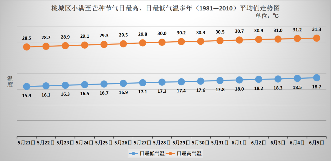 從上圖可以看出,過去30年間,我市自進入小滿節氣后氣溫整體雖一路高歌但漲勢緩慢,5月下旬,日最高氣溫平均值在30℃左右,日最低氣溫平均值在16-19℃。