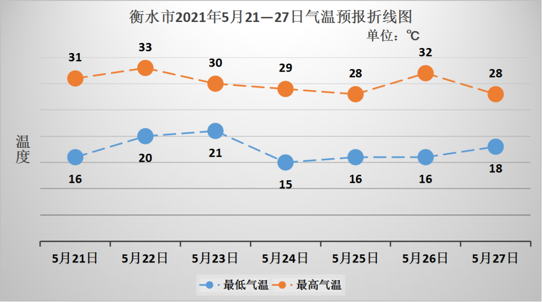 具體天氣預報為:5月21日,晴間多云,氣溫:31到19℃;5月22日,多云轉陰,南風3~4級,氣溫:33到20℃;5月23日,多云轉晴,氣溫:29到16℃;5月24日,晴間多云,氣溫:29到15℃;5月25日,晴間多云,氣溫:30到19℃;5月26日,多云轉晴,氣溫:33到18℃;5月27日,晴轉多云有小雨,氣溫:32到17℃。