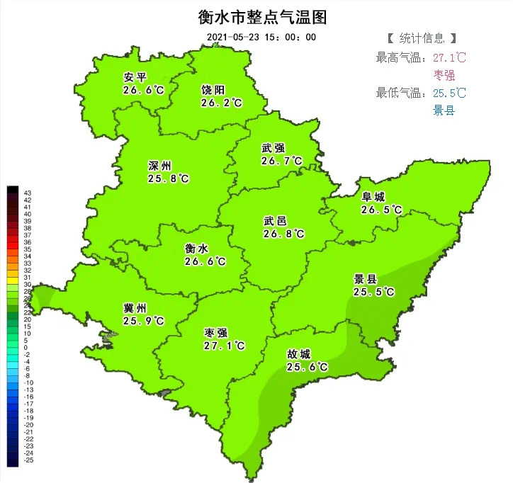 受此次降雨的影響,23日衡水的氣溫相比前一日有所下降,午后三時(shí)各縣市區(qū)的氣溫在26℃左右,相較于22日32.5℃的炎熱,體感上舒適宜人。