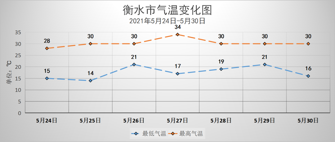 具體天氣預(yù)報(bào)為:5月23日夜間,晴間多云,南風(fēng)轉(zhuǎn)北風(fēng)2級(jí),最低氣溫14℃到15℃;5月24日,晴間多云,偏西風(fēng)3~4級(jí),氣溫:28℃到15℃;5月25日,晴間多云,西南風(fēng)4~5級(jí),陣風(fēng)6~7級(jí),氣溫:30℃到14℃;5月26日,晴轉(zhuǎn)多云,南風(fēng)轉(zhuǎn)西北風(fēng)4~5級(jí),氣溫:30℃到21℃;5月27日,晴轉(zhuǎn)多云,西南風(fēng)3~4級(jí),氣溫:34℃到17℃;5月28日,多云轉(zhuǎn)晴,西北風(fēng)3~4級(jí),氣溫:30℃到19℃;5月29日,多云,北風(fēng)3~4級(jí),氣溫:30℃到21℃;5月30日,晴間多云,南風(fēng)3~4級(jí),氣溫:30℃到16℃。
